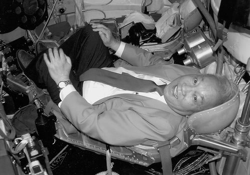 2003年9月,梁思礼在中国航天员训练中心体验航天员训练舱座椅。