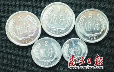 这些套币中,1981年1分硬币、1980年2分硬币,以及1979年、1980年、1981年的5分硬币,因收藏投资价值极高,被收藏界称为硬币中的 “五大天王”。林锋告诉记者,1981年1分和1981年5分目前的价格在2500元左右、1980年2分和1979年5分价格约为1500元、1980 年5分价格则在1800元左右;市场上成套的“五大天王”,定价最高直逼30000元。