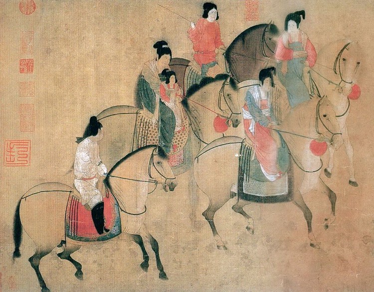 这是杜甫《丽人行》的前几句,描写的是唐代杨贵妃的姐姐秦国夫人、虢国夫人出行游春的姿情。杨贵妃受宠后,其堂兄杨国忠登上相位, 她的三个姐妹被封为 秦国、虢国、韩国夫人,经常出入禁中,唐明皇以“姨”呼之。尤其是虢国夫人,与其从兄杨国忠往来密切,经常骑着高头大马,并髻入宫,道路为之掩目。