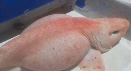 墨西哥一家专门组织出海捕鱼活动的公司近日在其官方网站公开了一条古怪鱼的照片。这条鱼呈浅粉红色,看起来似鲨鱼,鱼腹部分鼓胀如气球,更有一双如外星人的眼睛。