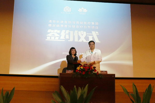 新华网4月19日电(孙慧)让居民在社区里面把糖尿病管理好,特殊情况下由三级医院提供支持,这一慢病管理体系,给天通苑居民就诊带来了便捷。为力推社区糖尿病慢病管理,昨日,北京清华长庚医院内分泌科与青岛菩提医院管理有限公司签约,合作开展糖尿病患者分级诊疗项目,计划与基层社区医疗机构组建联合服务体,通过智能化硬件终端与软件系统,对社区糖尿病患者进行长期管理。