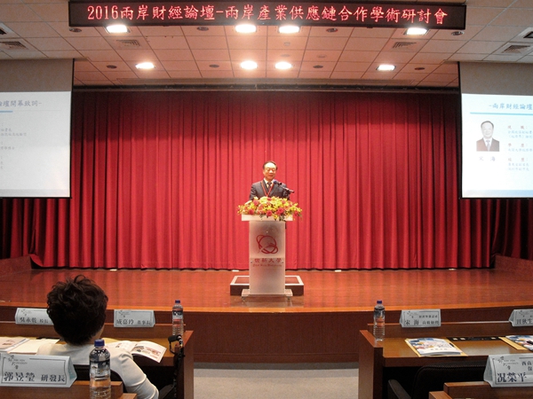 宋海副主席在致辞中首先向筹办研讨会的世新师生表示感谢。他认为,未来两岸经贸关系仍将处于良好时期,产业分工合作潜力巨大,特别是大陆提出“十三五”规划后,大陆经济进入新常态,从追求规模、速度的粗犷发展方式转向高效、集约的精细发展方式,大陆经济的转型升级和稳健增长将为两岸经贸合作提供坚实的基础。为更好实现两岸经济互补、共同发展,他建议,一是找准产业合作发展方向,把握发展新机遇。大陆在全球产业分工中向中高端升级,台湾正在向制造业服务化、服务业科技化、服务业国际化转型升级,两岸产业转型升级将提供新的发展机遇;二是深化新兴产业合作,培育参与全球竞争的新模式;三是扩大产业合作参与面,提升产业合作新格局;四是发挥联合协调的功能,降低产业合作交易成本。最后,他指出未来两岸可以发挥各自优势,在金融、文创、健康产业和其他战略性新兴产业方面开展更广泛的合作。