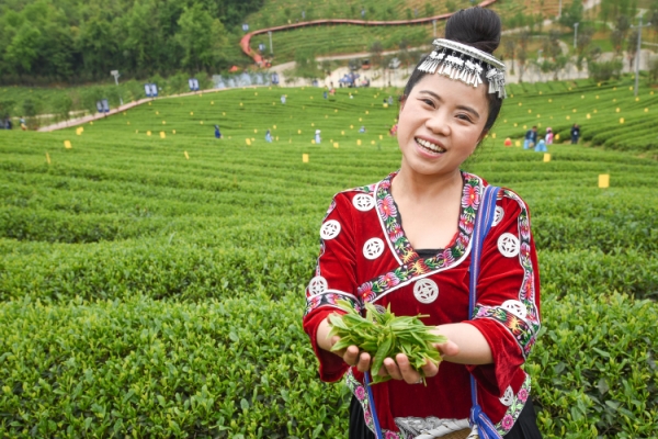 4月19日,一名苗族妇女在贵州省遵义市余庆县二龙茶场采茶。