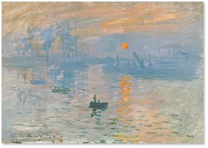 1874年,在一次画展中莫奈展示了他的作品《日出·印象》?;嫔厦挥芯咛宓谋尘?,有的只是日出时海上朦胧的景象,无论是背景还是前面的人物都没有具体的影相。而莫奈自己也说,这并非海上的实景,而是根据自己印象中海上日出的情景所画。