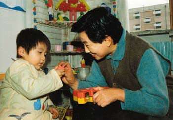 图为第九、十届全国政协委员万选蓉陪儿子梁小昆做游戏,如今儿子已是北京电影学院副教授。