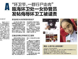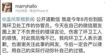 瓯海行政执法局一位负责人说,当面询问后得知,小吴是在下班后发的朋友圈,她的原意是想表达环卫工工作辛苦,结果用词不当。当她觉察到不妥之后,马上进行了删除。
