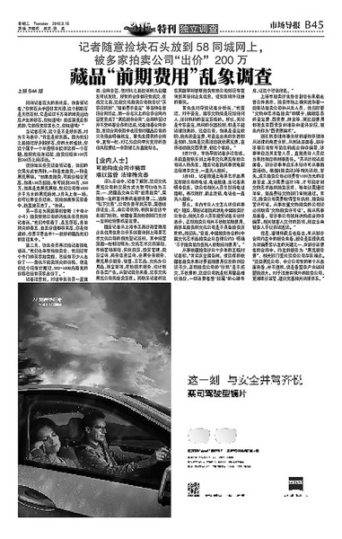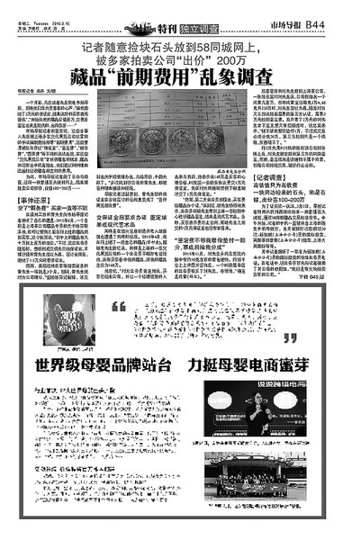 今年3.15,《市场导报》记者根据众多读者的投诉深入调查后,对盘踞于上海的诸多藏品交易诈骗团伙予以曝光,披露这些公司以“精湛”的话术和雷同的手法,大肆骗取“保证金”、“鉴定费”、“服务费”、“图录费”等各种收费的行为(详见导报2016年3月15日 《独立调查》B44-45版)。