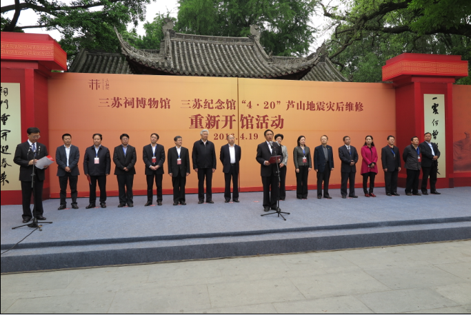 在开馆仪式上,中共眉山市委书记李静在致辞中代表中共眉山市委、市人大常委会、市政府、市政协和350万眉山人民,向长期关心支持眉山发展和三苏祠博物馆、三苏祠纪念馆灾后恢复重建工作的农工党中央、农工党四川省委、中国初级卫生保健基金会表示最衷心的感谢!并希望三苏祠以此次彻底修缮为契机,更好地承载起让东坡文化千古流芳的重任,继续让东坡文化在灿烂的中华文明中散发她独特的魅力。
