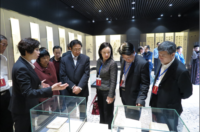 图为农工党中央副主席龚建明参观“4?20”芦山地震灾后修缮的四川眉山三苏祠博物馆