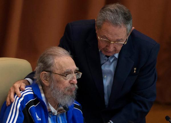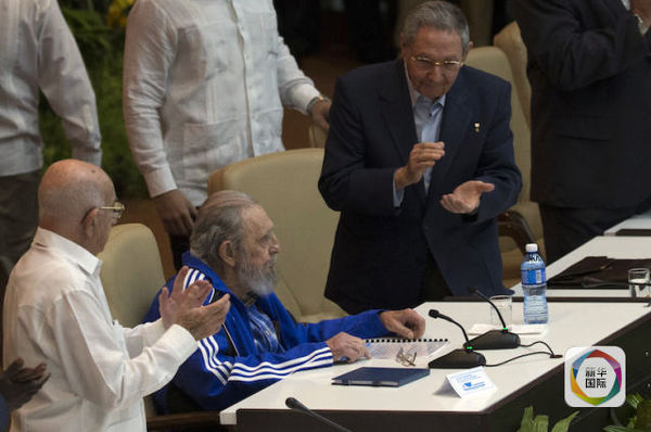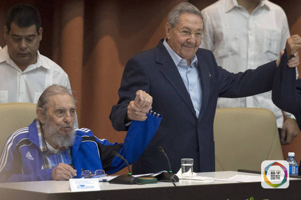 古巴革命领导人菲德尔·卡斯特罗身穿蓝色运动外套,里面是一件颜色相近的花格子衬衫,坐到了主席台正中位置。他的弟弟、刚刚连任古共中央委员会第一书记的劳尔·卡斯特罗穿着西装,但没有系领带,坐在哥哥的左侧。