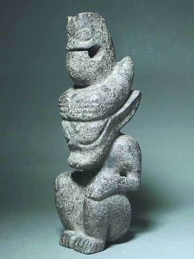这不是一个能被黑皮玉收藏圈普遍接受的变相认可,但是一个认识上的进步。相似的器型与玉质,相似的文化属性与宗教色彩,相似的艺术造型与制作工艺,无法回避的仍然是两者之间的某些明显差异。首先是文化色彩和历史信息上的差异,相比红山玉器型本身透露出的文化内涵,黑皮玉则在表面上直接雕出大量笔划清晰的阳刻古文字符号。纵观张一平的藏品,这些记载着远古文明的神秘字符在圆雕人物、片雕玉佩、复合人兽(禽)和玉猪龙上都有体现,字符越少的笔划常常越简单,有的字符结构复杂并伴有象形画意。其中,一件高60厘米的单体黑皮玉人身上字符多达25个,通体遍布。而在高47厘米、宽47厘米的玉猪龙与蛙女复合造型的双面玉雕上,字符超过35个,还不包括磨损难辨的部分。为什么要在这么大型的玉雕上采取费时费工费料的阳刻而不是阴刻,如此众多的字符是否是一篇完整的铭文,它所代表的又是一页什么样的华夏文明,都是一个个耐人寻味的费解之谜。