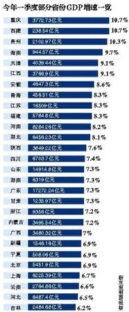 截至昨日,全国28个省(区、市)对外公布了一季度GDP成绩单:重庆和西藏以10.7%的增速领跑全国,广东、江苏、山东继续稳坐“万亿俱乐部”。