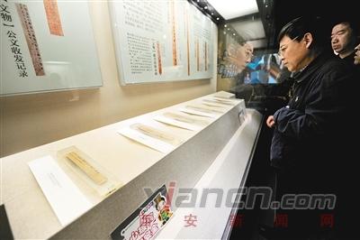 昨日,市民观看展出的秦简牍和秦封泥。记者翟小雪 实习生马艺玄摄