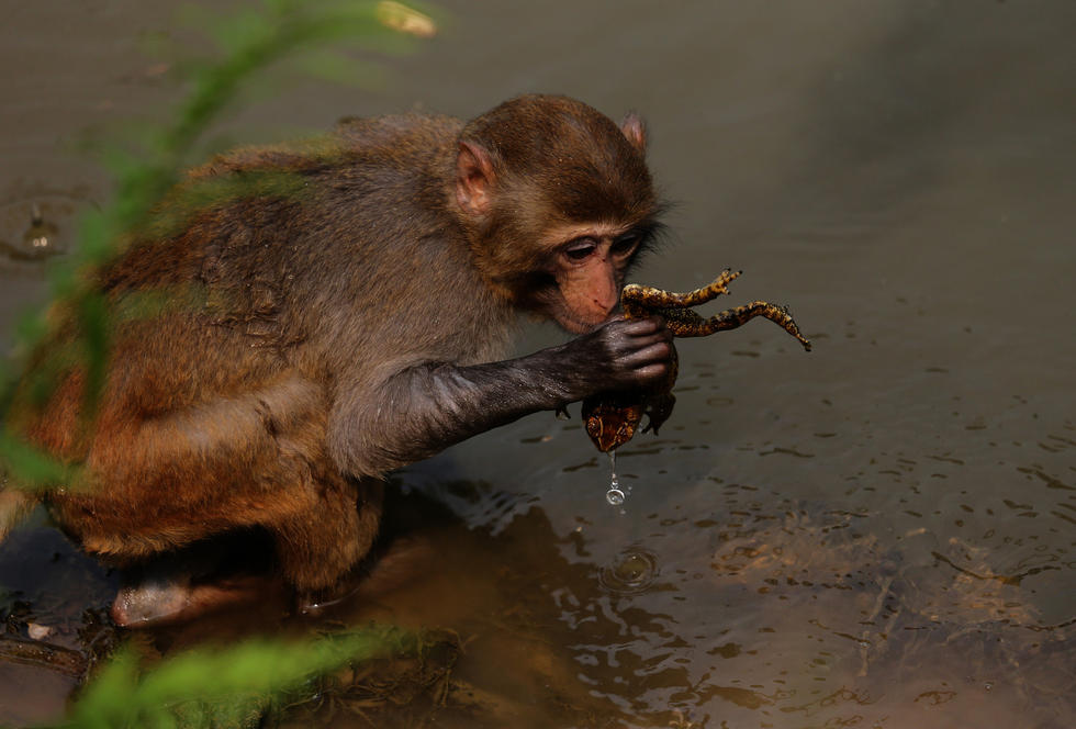 猴子并不想将蟾蜍吃掉,只是拿它在手中玩来玩去。当猴子想尝鲜时,将蟾蜍送到自己的鼻子下闻了闻,感觉有种异味又放弃生吃。