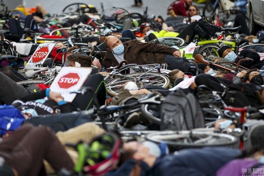 当地时间4月27日,英国伦敦,市民在交通部外戴口罩躺尸抗议,反对空气污染。“停止杀害骑自行车者”的组织者称,在伦敦每年有9500人因空气污染而死亡,95000人因空气污染患上如肺病、心脏病等疾病。