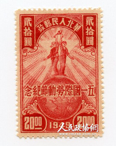 1949年5月30日,华北邮电总局发行“五一劳动节纪念邮票”1套15枚。此套邮票系应1949年5月1日召开的华北第一届职工代表大会的请求,经华北人民政府批准发行。邮票主图为站立在地球上手举铁锤和镰刀做交叉状的工人和农民,背景为四射光芒。地球上部横列右读“五一国际劳动节纪念”。上方正中眉形框内为“华北人民邮政”,两侧为竖写汉字面值,下方正中为“1949”。