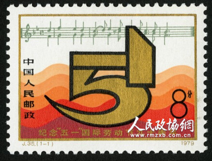 1979年5月1日,我国又发行了一套“J.35纪念五一国际劳动节90周年”纪念邮票,全套1枚。邮票图案以《国际歌》前奏乐句和黄河为背景,用铁锤和镰刀巧妙地组成两个金色的阿拉伯数字“5”和“1”。这枚邮票的图案设计独具匠心,寓意深刻,融思想性与艺术性于一体,完美地表达了邮票的主题。