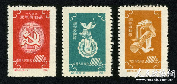 1952年5月1日“纪15国际劳动节”专题邮票发行,其作为新中国成立后发行的第一套“国际劳动节”纪念邮票,全套3枚,第一枚“胜利的光辉”用鲜红作底色,邮票图案正点出主题;第二枚“工农联盟”以绿色作底,图案中间是齿轮和齿轮上镶着的麦穗;第三枚“和平建设”则是用茶色作底,中间图案为工厂、麦穗缠柄的大铁锤和腾飞的和平鸽。这三枚邮票均在不同的部位用汉字或阿拉伯数字标上“1952”年份。