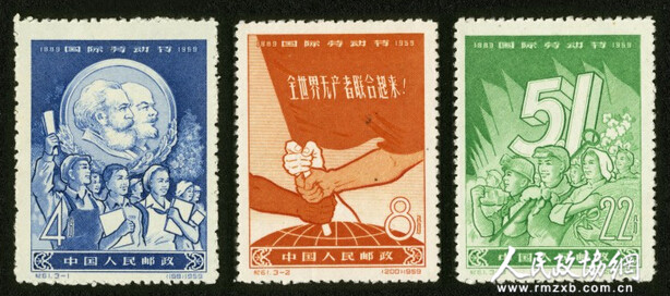 1959年5月1日,我国发行“纪61国际劳动节专题邮票”,全套3枚,由孙传哲设计,北京人民印刷厂印制。此套邮票共3枚。分为“学习马列主义”、“全世界无产者联合起来”,以及“庆祝五一劳动节”,“51”字样非常醒目。