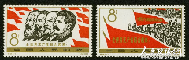 1964年5月1日,我国发行“纪104全世界无产者联合起来纪念邮票”一套,全套2枚,第一枚图案是数面红旗簇拥的马克思、恩格斯、列宁和斯大林四人并列侧面头像;第二枚为“全世界无产者联合起来”图案。邮票设计者采用木刻的技法,虚实相映,产生鲜明的艺术效果。