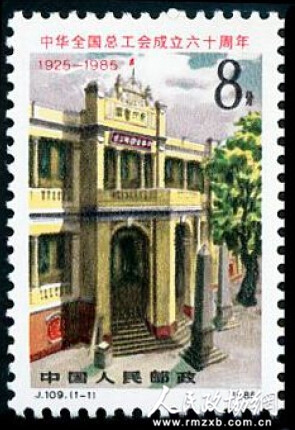 1985年5月1日,我国发行“J.109中华全国总工会成立六十周年纪念邮票”一套1枚,既纪念了全国总工会60周年华诞,也庆祝了国际劳动节。该票主图是全国总工会成立时的会址广州惠州会馆。