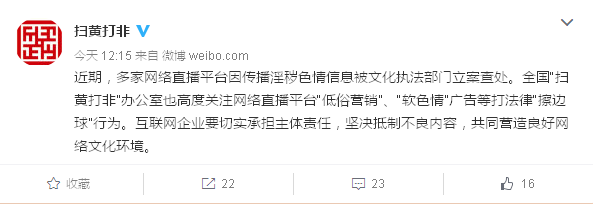 【新民网讯】据全国“扫黄打非”办公室官方微博消息,近期,多家网络直播平台因传播淫秽色情信息被文化执法部门立案查处。全国“扫黄打非”办公室也高度关注网络直播平台“低俗营销”、“软色情”广告等打法律 “擦边球”行为?;チ笠狄惺党械V魈逶鹑?,坚决抵制不良内容,共同营造良好网络文化环境。