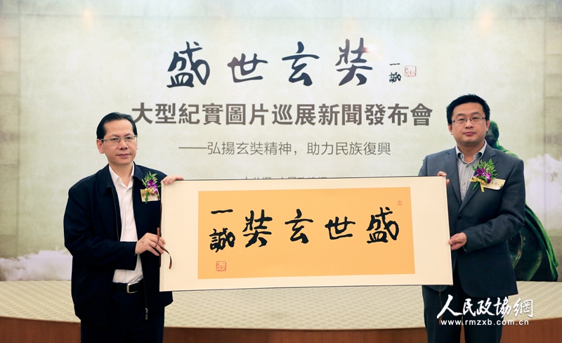 大公报社委、大公网总裁林学飞与人民政协报副社长王相伟展示中国佛教协会名誉会长一诚长老为本次活动题写的《盛世玄奘》墨宝(摄影:姚勇)