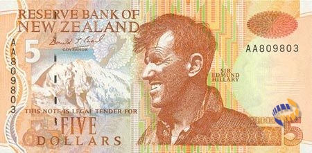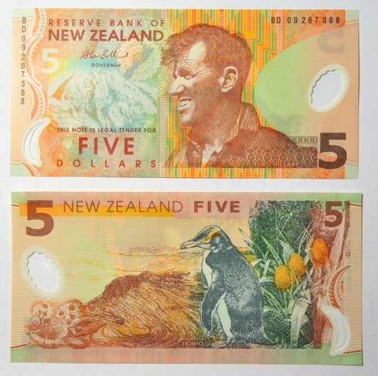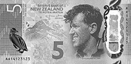 2015年9月1日,新西兰央行正式公布第7版5新西兰元和10新西兰元纸币票样。其中,5新西兰元纸币主色调为橙色和褐色,正面主体图案是首个征服世界最高峰珠穆朗玛峰的登山家埃德蒙·希拉里爵士的头像,以及新西兰南岛库克山山峰和南岛黄眼企鹅。背面主体图案是黄眼企鹅和新西兰特有植物。另外,新版纸币还升级了多种防伪措施。