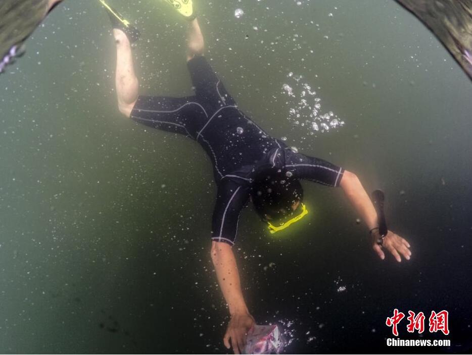 高健在湖底搜寻垃圾。 杨华峰 摄