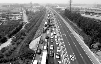 ▲昨天13时,京平高速出京方向拥堵。京华时报记者潘之望摄