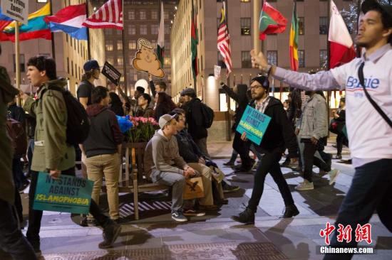 资料图:4月14日晚,民众在纽约洛克菲勒广场附近进行反特朗普游行。