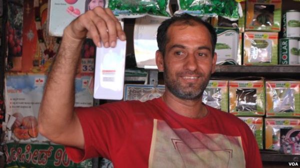 印度迈索尔一位集市摊主向记者展示他心爱的小米手机。(美国之音电台网站)