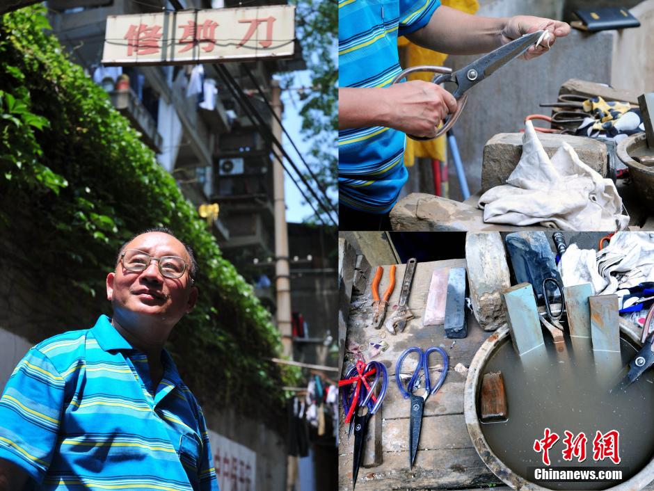 在福州法海路花园弄的一条小巷里,有这样一家专门磨剪刀的百年剪刀店。60岁的潘依伯,在这里磨了40年的剪刀。与我们熟知的流动磨剪人和磨刀人不同,潘依伯这家本土“老字号”磨剪店,做的都是熟客生意。因技术好、收费合理,在上个世纪80年代,潘依伯靠磨剪刀,月收入就有1500元人民币;但1995年以后,生意渐渐惨淡,到现在一个月只能磨两三把剪刀。潘师傅感叹,如今靠磨剪刀是活不了了,原来的本行成了现在的副业。(拼版图片)(资料图片) 中新社记者 张斌 摄