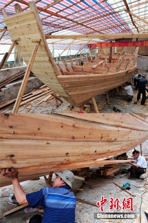 2013年5月7日,在福州市中国十大历史文化名街三坊七巷福船文化馆,来自福建福鼎的郑师傅和65岁的老船匠黄师傅正对最后一块船板进行加工。福建的福船与广船、沙船、鸟船并列为中国古代四大船系,其中“水密横舱壁”这项技术就是在福船上最先采用和发明的。随着工业化进程的加快,现在建造的大多使用铁壳船舶,木质船几乎没有了市场。而且,造船是个慢工活,比较辛苦,年轻人不爱学,木质造船业面临生存与传承两大?;?010年,福船制造技艺被联合国教科文组织列入“急需?;さ姆俏镏饰幕挪肌薄#ㄆ窗嫱计ㄗ柿贤计┲行律缂钦?张斌 摄