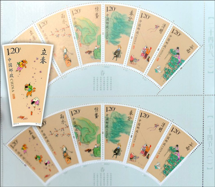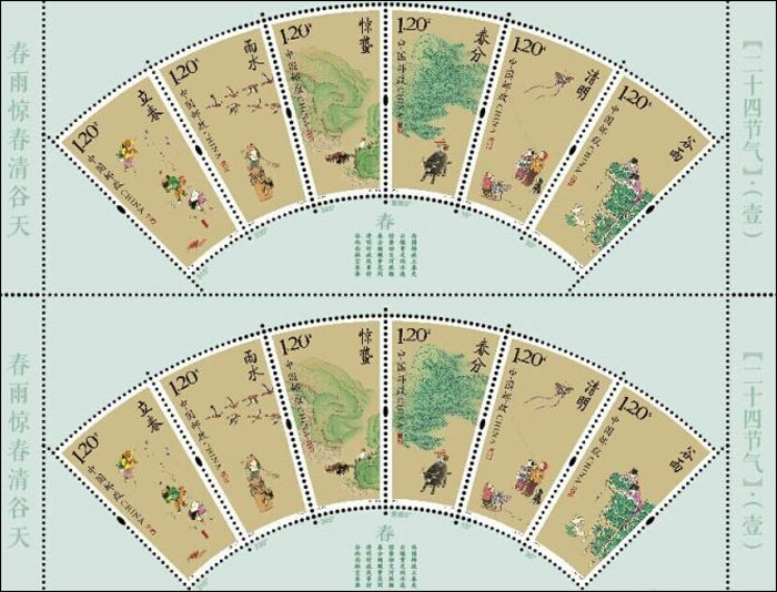 二十四节气将一年内太阳运行的位置变化及由此引起的地面气候演变秩序,划分为24个阶段,每段约隔半个月时间,然后分配在12个月里,以反映四季、气温、 物候等情况。继去年2月发行《二十四节气》特种邮票第一组之后,中国邮政定于今年5月5日发行《二十四节气》特种邮票第二组,拟发行立夏、小满、芒种、夏 至、小暑、大暑等6个节气的邮票。