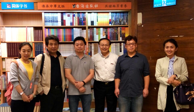 在台湾政治大学书店台海出版社专柜前,考察团与该店店长合影留念