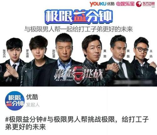 作为《极限挑战2》的独家播出平台,优酷独家发起“极限益分钟”计划,旨在与节目一起发扬公益精神,挑起社会担当。(张艺兴“极限益分钟”的挑战视频:http://v.youku.com/v_show/id_XMTU1NDYzODY0NA==.html)该计划号召全民通过挑战1分钟自我极限的方式传递正能量,募集善款,汇入东方卫视和中国扶贫基金会共同设立的“极限公益成长计划”。挑战者在微博上传自己的挑战项目,公开挑战粉丝,如果粉丝中有人能打破他们的纪录,则挑战发起者在娱乐宝上捐出10元公益基金。截至目前,张艺兴“极限益分钟”挑战视频发出仅4天,该公益项目已吸引35万网友热情回应。