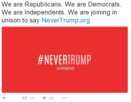 “我绝不会投票支持@realDonaldTrump。请加入我的行列,到NeverTrump.com网站添上你的名字,”华盛顿一家政治媒体公司的创始人帕特里克·鲁菲尼(Patrick Ruffini)写道。