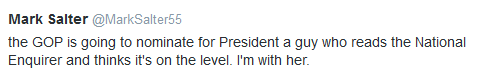 “共和党即将提名的总统候选人是个读《国家询问报》(National Enquirer)并认为这个八卦小报可信的人,”索尔特周二晚在Twitter上写道?!拔抑С炙??!?/p>