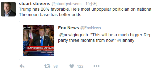 “我认为,唐纳德·特朗普已被证明是一个心理不平衡的人,完全不具备当总统的资格。我不会支持他,”斯图尔特·史蒂文斯(Stuart Stevens)在周二晚接受记者采访时说,他曾为罗姆尼2012年总统竞选做战略策划。“每个人都必须做出自己的选择。我认为特朗普令人厌恶,将被证明是共和党的灾难。我呼吁大家继续反对他?!?/p>