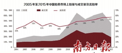 记者注意到,在中国拍卖市场拍品的流拍率、未支付款情况严重。记者从数据图表中看到,从2011年至2015年,流拍率在逐年增加,分别为49%、50%、53%,57%、57%。