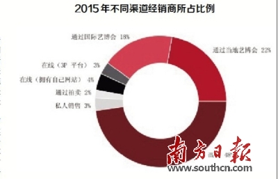 随着交易渠道增加,艺术品交易销售渠道近年来出现较大变化。记者从报告中获悉,2015年在线销售的占比达到7%,通过拍卖销售的占比为2%,私下交易3%,本地博览会占比22%,国际博览会18%,画廊内销售占比48%。