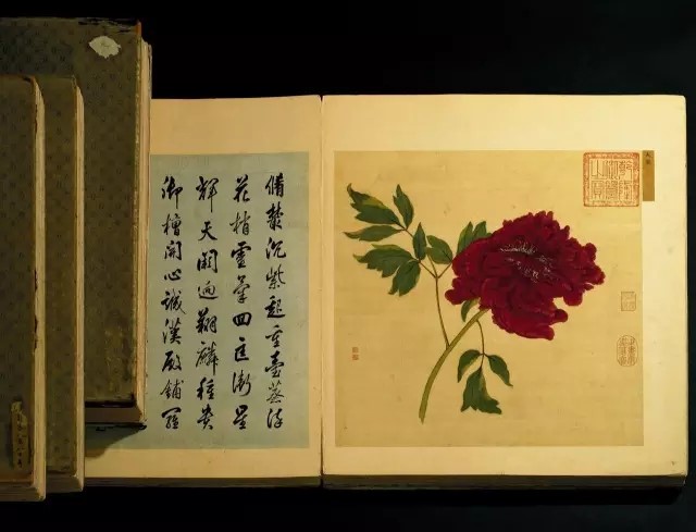 全套牡丹谱两百开整,以元、亨、利、贞为名分列四册,皆得乾隆、嘉庆、宣统三帝鉴藏预览,并有石渠宝笈、御书房鉴藏宝等诸方鉴藏之印以证源流。