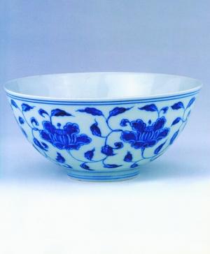 成化、弘治年间,朝廷几番下令景德镇减烧或停烧御用瓷器,因此,这个时期的官窑瓷器流传至今者稀少,但质量很高。西藏博物馆收藏的成化青花缠枝花卉纹碗,不但胎、釉极为精美,而且器物里外都有花纹装饰,是成化官窑青花中的绝佳品。
