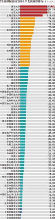 截至昨日,75所教育部直属高校中,至少有73所高校公布了其2016年度预算,今年73所高校的预算支出总额达到2957.18亿元。预算支出排在前三位的分别是清华大学、浙江大学和北京大学,年度预算数均超百亿元。