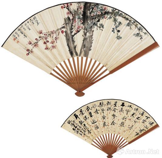 马连良、梅兰芳 《梅花图·书法》 成扇 洒金设色·纸本 1953年作