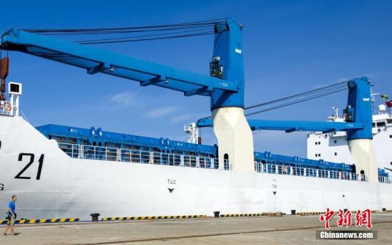 5月14日16时许,中国长征七号运载火箭安全抵达海南文昌清澜港。该火箭将被分段运至发射场区,按计划进行发射前各项测试准备工作,计划在6月下旬择机发射。据了解,5月8日,中国卫星海上测控部所属远望21号火箭运输船从天津港装船起航,途经渤海、黄海、东海、台湾海峡、南海等海域,安全抵达海南文昌,总航程近1700海里。图为承担运输中国长征七号运载火箭的远望21号火箭运输船??吭诤D衔牟謇礁?。中新社记者 骆云飞 摄
