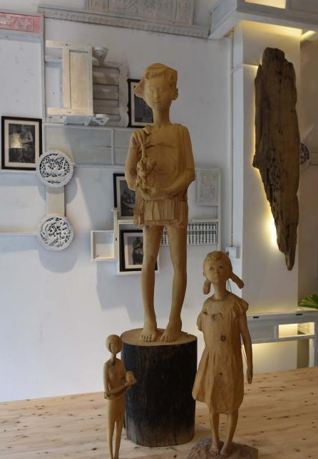 “这个,这个,这个,爸爸做的,都是我!“工作室入口,三个高一米左右的木雕靠墙摆放,只是刻出了大致轮廓的木雕,仍然可以清晰辨认出是一个齐耳短发、穿着吊带裙的女孩。最靠近大门的木雕,女孩手中抱着一只憨态可掬的猫头鹰,旁边的女孩,头顶上趴着一只慵懒的猫咪。
