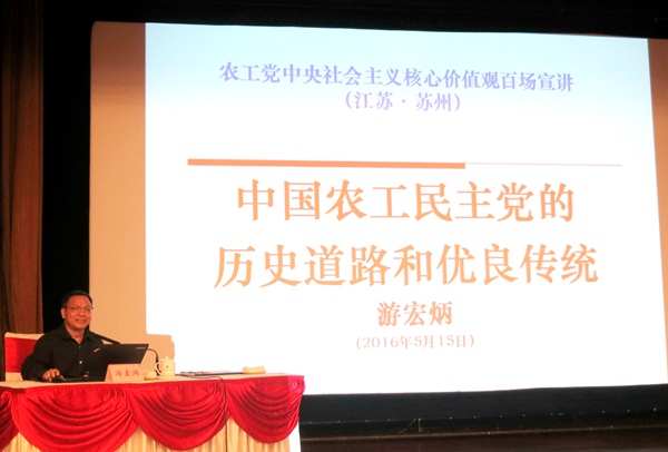 2016年5月15日下午,农工党“走进基层、贴近党员,培育和践行社会主义核心价值观”主题宣讲走进江苏苏州。农工党苏州市委会主委周俊主持活动并讲话。农工党江苏省委会秘书长毛庆卫、农工党苏州市委会副主委兼秘书长张健红、农工党南通市委会副主委吴鸿飞、农工党苏州市委会常委唐燚等出席活动。