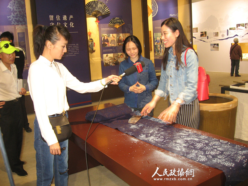 有关媒体现场采访正在中国园林博物馆布上青花——南通蓝印花布艺术展上体验蓝印花布制作工艺的观众。梓涵摄影报道_副本